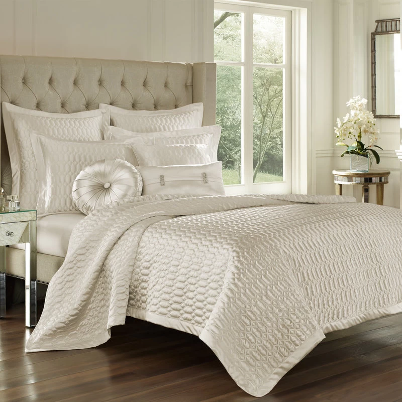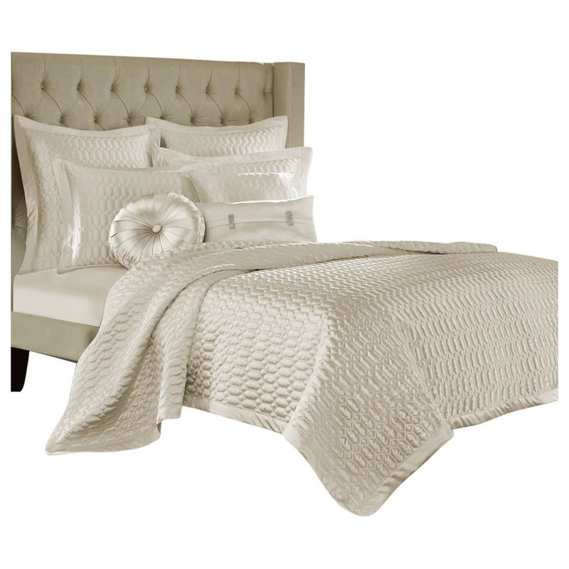 Shams and bedding sold separately | Add some luxury to your bedroom with this glamorous Saranda Natural Quilt/Coverlet. This fabric is a highly constructed satin, meant to add elegance to any bedroom. Available in four different color ways, this custom geometric quilted pattern is the luxury that the Coverlet prevails. Full/Queen Coverlet Dimensions: 90″x90″ King Coverlet Dimensions: 108″x94″ Care Instructions: Dry Clean Only Fabric Content: 100% Polyester Fill Content;100% Polyester Reverse of Coverlet Content: 100% Polyester Imported